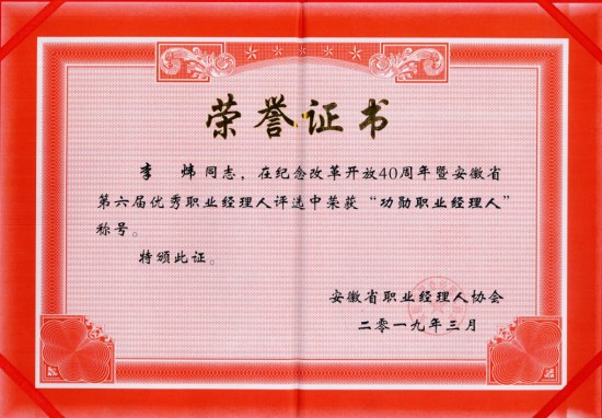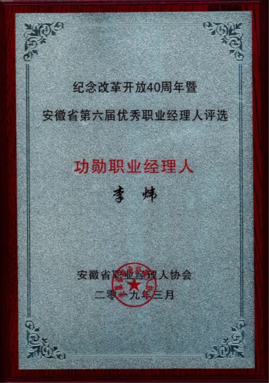 3月17日在合肥天鹅湖大酒店召开了“不忘初心 追梦前行”安徽省职业经理人协会三届二次会员大会暨2019年会。为表彰安徽职业经理人们长期以来的默默奉献和远见卓识,本届大会安排了职业经理人评选活动并对“功勋职业经理人”、“杰出职业经理人”、“优秀职业经理人”称号的获得者进行了颁奖。国祯集团董事局主席李炜荣获“功勋职业经理人”称号!     “功勋职业经理人”是改革开放坚定的执行者,积极的践行者,他们成就了社会与企业的共同发展。在40年的惊鸿巨变之中,他们始终坚持立足民生的基础行业,把握住了新时代的脉搏。