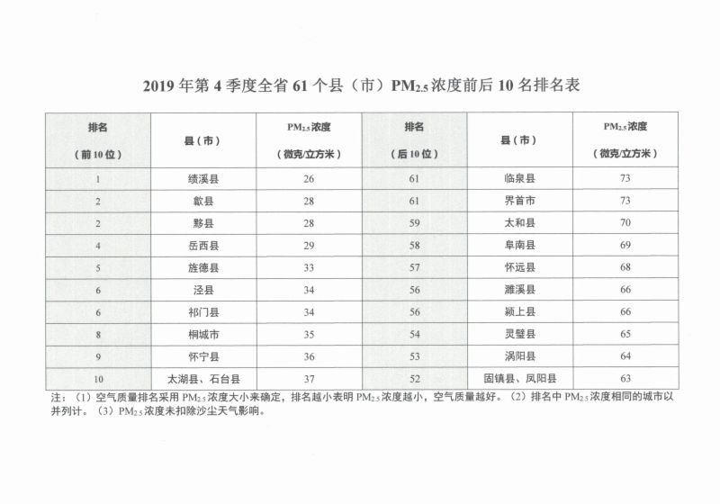 为贯彻落实国务院《大气污染防治行动计划》、《安徽省打赢蓝天保卫战三年行动计划实施方案》有关要求,加强信息公开和社会监督,推动城市空气质量改善,按照原环保部统一部署及省生态环境厅工作要求,近日,省生态环境监测中心完成《2019年第4季度全省61个县(市)PM2.5浓度前后10名排名表》编制发布工作。