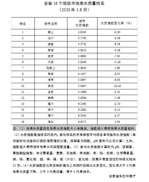《全省16个地级市地表水环境质量排名(2020年1-8月)》显示,黄山、池州、铜陵市位列前3位,其中黄山市地表水环境质量最好,城市水质指数为2.9243,水质指数变化率为-0.65%。淮北、宿州、滁州市排名位列后3位,其中排名最后的淮北市城市水质指数为6.8571,水质指数变化率为1.39%。