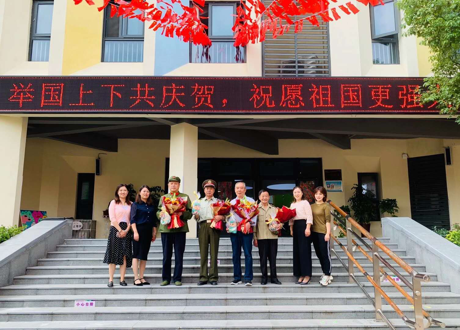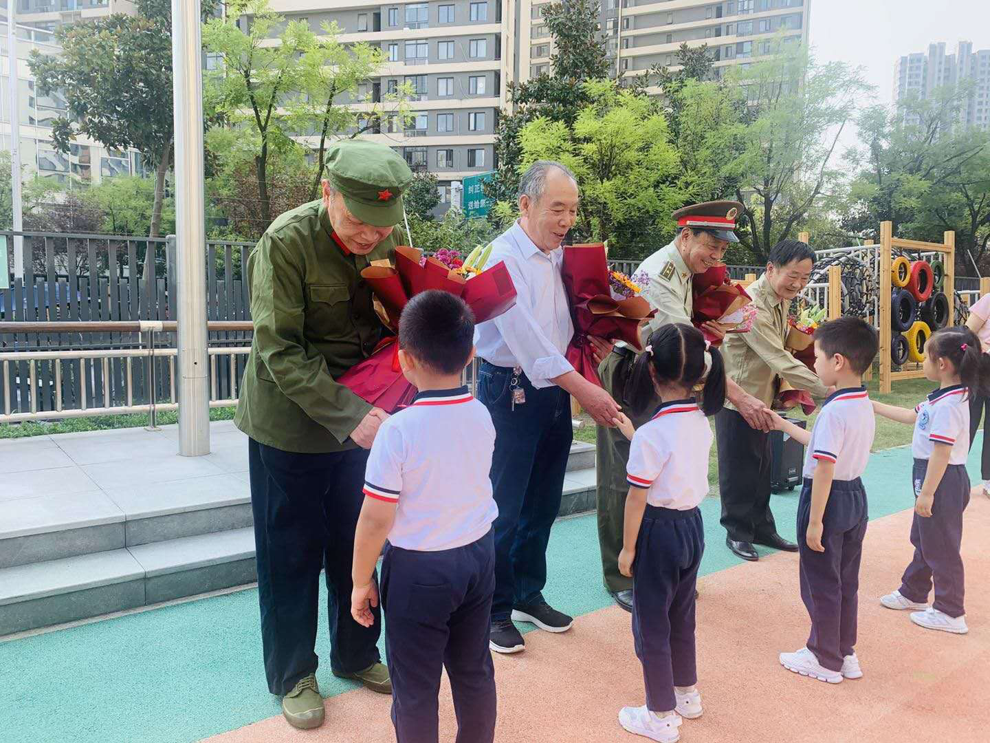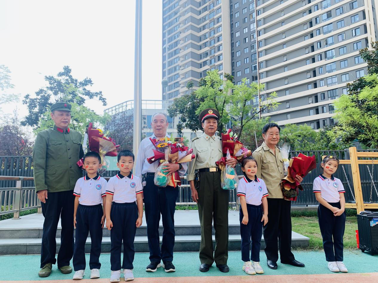 礼毕后,陈璐园长带领全体师幼回顾了祖国母亲过去曾经遭受的屈辱,教育小朋友们从小要树立强烈的爱国意识,从小事做起,从点滴做起,再塑中华民族的精神品格和道德风貌。 升旗仪式中邀请了四位退伍老兵走进幼儿园和小朋友一起参加升旗仪式。他们腰背弯曲,皱纹丛生,但他们弯曲的腰背,曾经挺立起中华民族的脊梁,他们沟壑般的皱纹里,铭刻着不朽的抗战史诗和民族精神。老兵爷爷们用他们的亲身经历讲过去的故事,小朋友们聚精会神的聆听,脸上充满了崇敬之情。随后,大班幼儿代表为老兵爷爷们献上鲜花和手工制作的礼物,表达敬意!