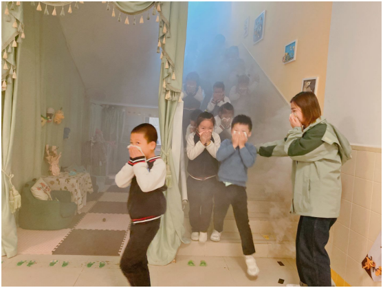 上午十点整,伴随着第一遍铃声响起,幼儿园内烟雾四起,全体师幼立即行动起来,迅速用湿毛巾捂住口鼻。紧接着第二遍铃声响起,在班级教师的组织下,全园幼儿低头、弯腰从指定路线快速有序撤离到达指定安全位置后,各班教师立即查看幼儿情况,清点班级人数,确保无一人遗漏。清点人数后由各班班主任向总指挥园长陈璐报告本班演练情况。